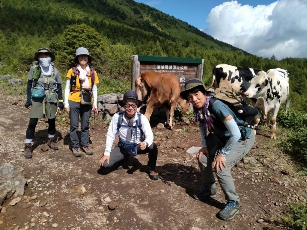 立川駅南口に5時40分集合し、本日の参加者5名が、車1台に乗り、一路目的地の湯ノ丸高原を目指す。3連休前の金曜日だが、まだ6時前で通勤にも早く、行楽客もいないため、大きな渋滞もなく、当初予定より早く8時10分に湯ノ丸高原の駐車場に到着。気温は17℃で乾いた風が東京と全く違い、涼しいどころか少し寒い。支度を済ませ、8時29分に出発する。スキー場から登り始めるのだが、リフトが動き始めた。窓口を見ると8時30分開始。800円とやや高いが、急なスキー場の登りを割愛出来るのと、好奇心から乗ってみたくて、係の人に声をかけるが。明日からの運行のため乗れなかった、残念。スキー場の急斜面を直登する。木々が無く、なまじ上が良く見えるからキツイが、急斜面の先は緩くなっており、更には牧場の牛が待っている。牛は人慣れしているのか、のんびりしているが、つい美味しそうと思ったのが、バレてしまったのか、何か睨まれている気がした。牛の大きな糞に注意しながら、なだらかな山道を進む。しばらく歩くとツツジ平分岐に到着。ここは6月末ごろに来ると、国の天然記念物のレンゲツツジの花の大群落が見られるらしい。しかし6月末は、梅雨の真っ盛りで、花を楽しむだけならよいが、山登りが加わるとやはり梅雨明けの方が良いと思う。10分程歩くと、ここから登山道の看板がある。確かに道が細くなり、斜度もきつくなるが、それでも普通の登山道。