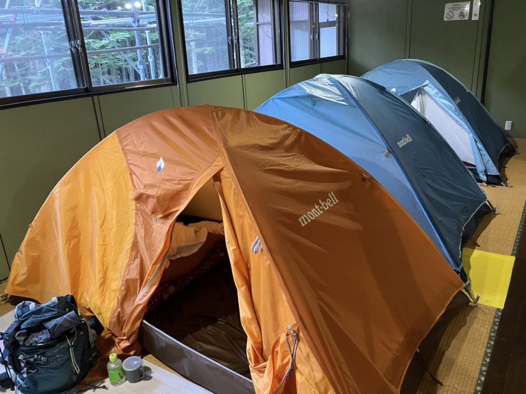 本を読んでもスケッチをしても(私は迷った末、軽量化を選び本を持って来なかった)昼寝をしてもいい贅沢な時間となる。日の当たり方で水の色が変わるのを眺めたり、魚や蜻蛉を眺めたりした。魚はフナで、双子池ヒュッテの先代がフナを雌池に放流したとのこと。いい時間だなあと思う。腰を上げたのは16時だった。ヒュッテに戻り、夕食までテニスボールを使ったストレッチをMAさん中心に行う。夕食はベトナムフェアの料理に舌鼓。大部屋には一人一つずつテントで寝るようになっていて、着替えにも便利で個人的なスペースが確保されていて安心感があった。