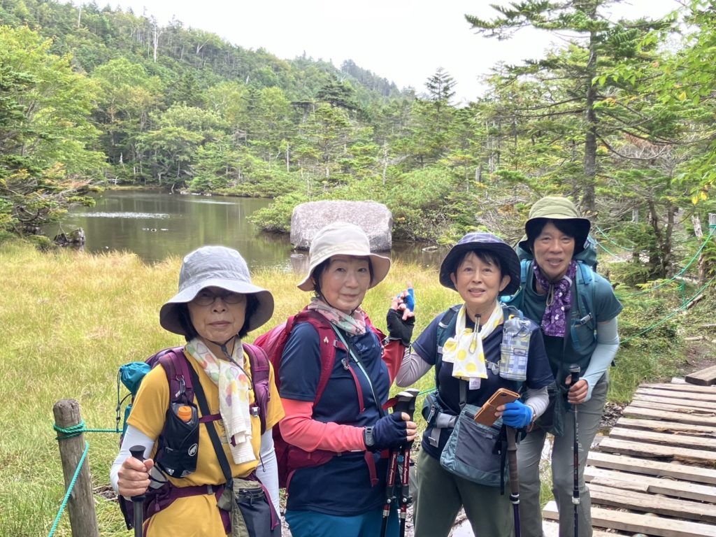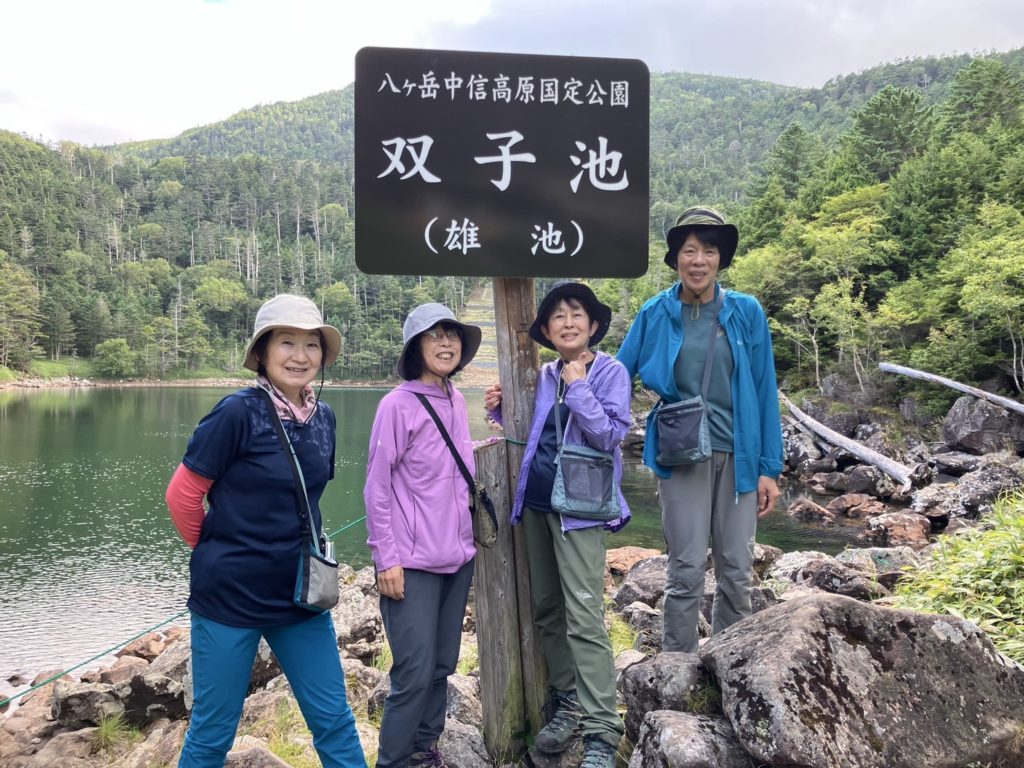 北八ヶ岳を目指し、道も空いていて車はかろやかに進む。車窓から山が見えてくると気持ちが高まる。車を降りると、おいしい空気が体に流れ込む。予定より少し早く8時半の臨時便のロープウェイに乗れた。山頂駅で準備体操をし、坪庭から歩き始める。今までここに来た思い出がよみがえって、話題となる。思っていたより涼しい。今まで何度か来た坪庭はピカピカ明るいイメージだったが、今日はご機嫌今ひとつのようだ。9時41分北横岳ヒュッテ着。そこから5分、七つ池へ下る。森の中にひっそりと池が現れる。今回のテーマは池巡りで、4つの池を巡る一つ目の池。七つあるのかと思ったけれど、一つに見えた。ここは、湿地に小さな池塘が点在している場所で、夏は苔や草が茂るので池の数が見えにくかったり、水量が少ないと池がつながって一つや二つに見えるらしい。日曜とあって人が多かったが、ここは静かだ。そこから北横岳(南峰)北横岳(北峰)に登るもガスって風が強かったので写真を撮って早々に、亀甲池へ下る。樹林帯に入ると風が収まり穏やかになってほっとする。広くなっている場所を見つけ昼食を取る。北横岳からこちらのコースは人がぐっと少なくなり静かだ。亀甲池までコースタイムでは60分とあるが、急坂なのでコースタイムの2倍みた方が良いとあった通り、滑りそうな苔と岩の急坂続きでお昼タイムも入れて2倍かかり、亀甲池に着いたのは12時24分だった。池の水が見えた時は、嬉しく心が弾んだ。緑に囲まれた亀甲池は、水面に青い空が映って森と一体になって見える。20分ほどそこでまったりとして、双子池に向かう。50分ほど歩くと双子池の雌池が見えてきた。三つ目の池になる。広々と明るい雰囲気。少し味わって、10分ほど歩き、13時52分今日の宿泊地双子池ヒュッテに着いた。目の前に雄池が広がっている。雌池よりも小さく、この水が飲料水として使われているとのこと。14時にチェックインを済ませ、雄池を見に行く。この先リュックを持って入ってはいけないという看板がある。雄池を汚さない配慮だろう。残念ながら一周できる道がなかったので、クールダウンの体操をヒュッテの前で行い、雌池まで散歩をする。