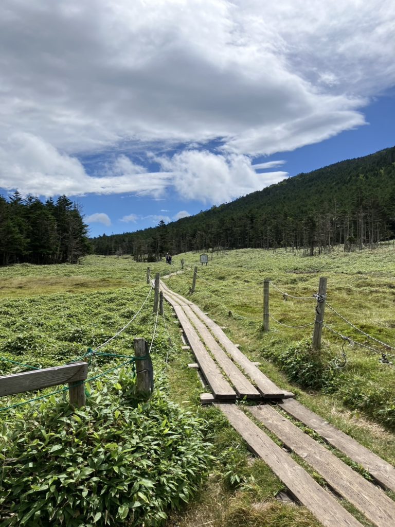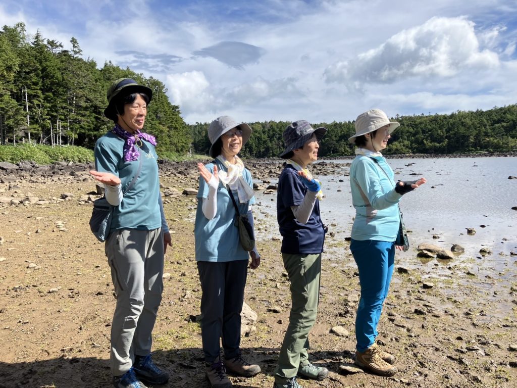 二日目は、6時55分、準備体操を済ませ双子池ヒュッテを後にする。朝のさわやかな空気の中、小川が流れるなだらかなハッピーロードを歩く。林道に出てしばらくすると雨池方面という道標があり、登山道に入る。8時46分、雨池到着。この四つ目の池が今回の一番大きな池で、この池だけ一周することができるようだ。水面が現れるたびにワクワクする。亀甲池にも感じたが水位が低めで岸が広めに出ていた。雄大な雨池を私たちだけで独り占めだったので、まるでプライベートビーチのようだと感想が出た。池を満喫し、雨池峠分岐からはけっこうな急坂を登り10時17分雨池峠に着く。そこから三角屋根の縞枯山荘までは木道が続き、広々とした空と草原が広がっていた。縞枯れ山荘はその日は閉まっていたが、そこでお茶をしようとしていたご夫婦としばしお喋りをする。そこからほどなく10時49分、北八ヶ岳ロープウエイ山頂駅に到着。思う存分池を巡り、たくさんストレッチができた山行だった。(昌子記)