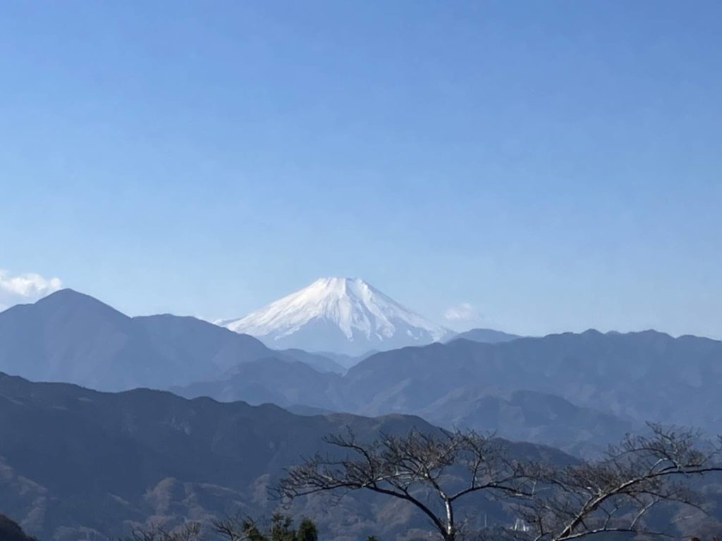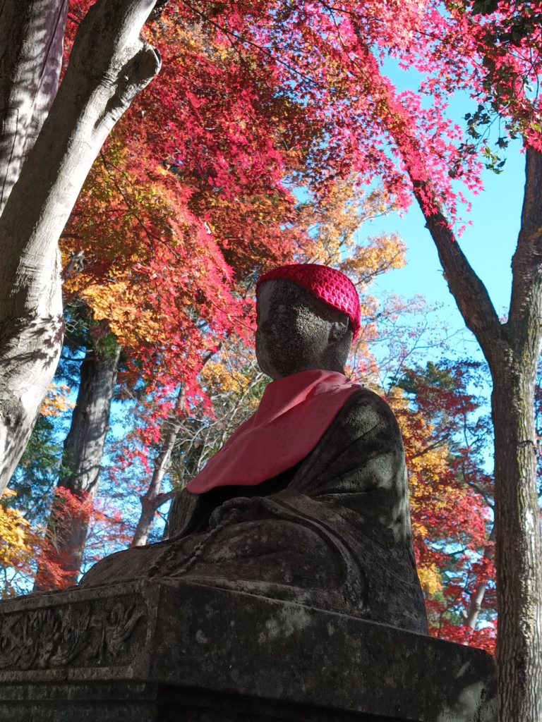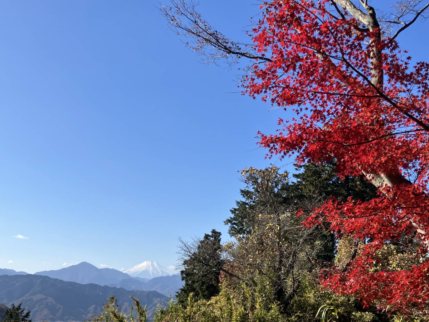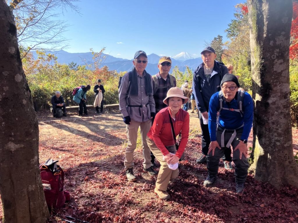 11/26(水)前日の寒さは消え去り、山日和。京王線高尾山口駅9時集合した5人。久々に合うYさん、2週連続参加のHさん。日曜に高尾山に登ったSさんはラッシュ並みの人出と言っていたが、今日はまばらな人影。ケーブル清滝駅前で体操して、東京高尾病院の坂から急な琵琶道へ。清滝駅は標高200m、琵琶道の終点11丁目茶屋は500m。途中、2回休みを入れて登る。茶屋で1号路に出ると観光客、浄心門手前で4号路・吊橋コースに入るが、まだ人が少ない。平日だからだろと言い聞かせるが、調子が狂う。みやま橋、日影沢(いろはの森)分岐、4号路の木道階段からは大岳山や景信山が見えた。行き交う人も増えて、やはり高尾山は人が多いと感じてきた。高尾山山頂からの富士山は素晴らし、雲がかかって無い富士山は珍しい。山頂標識には記念撮影のために20人位並んでいる。山頂での記念撮影は諦めて、もみじ台へ。細田茶屋が廃業して更地になっていたが、そこからの富士も良かった。ここで昼食。5号路を使い、富士道、薬王院山門へ、ここが1丁目。途中、権現茶屋前の隠れ紅葉名所「有喜苑」へ。地蔵さんと紅葉のショット。紅葉を堪能しながら、目の前で枯れ葉が散っていく。映画のシーンの様な風景。気持ちのいい高尾山でした。高尾山駅前の天狗焼きには長蛇の列、甘味を断念。リフト乗り場、金毘羅台からの八王子や立川方面は天候のおかげで、すっきり見えていました。二十一丁目の金毘羅台からは、めったに人が利用しない旧道金毘羅道へ。最近廃業したろくざん亭を過ぎ、落合信号に石碑が、そこには三十三丁目と彫られている。もう一つ本道四十四丁目と刻まれていた。高尾駅北口まで歩く。予定より1時間早く到着した。(T記) 歩き4H 9.2km 上り602m,下り631m