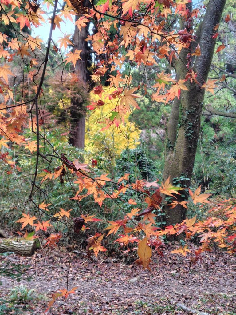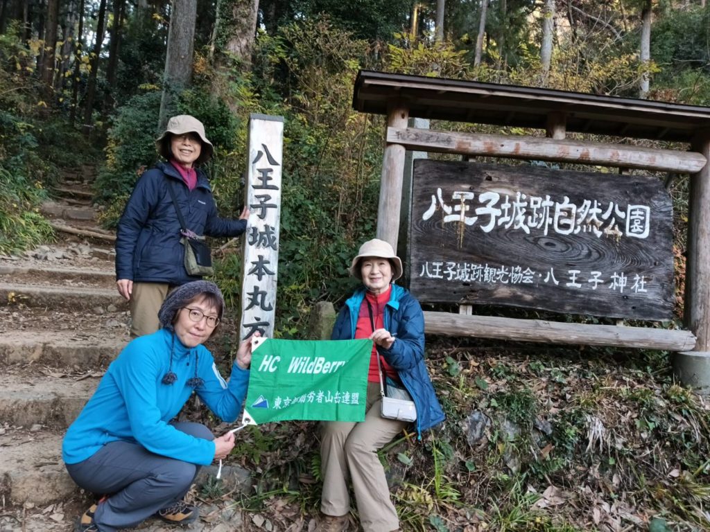 12/3(水) 高尾駅北口9時集合,前日にキャンセルが入ったので、4名 参加。 高尾駅9:12発小仏行 バスで 駒木野バス停下車。小仏関所跡の広場で体操。本日のキーワードは「北」と「城」。北は北高尾山稜の始まりの登山口から出発しました。地蔵平で4体の地蔵さんと記念撮影。この頃から、今日は他の人と会わないね、でもそのうち会うのでは・・、これが話題になった。上りの厳しい熊笹山、下りた所から富士見台への上りの間の尾根は素晴らし紅葉が楽しめた。富士見台で昼食、我々だけ。寒さもあって、短い昼食後は八王子城山に向けて下る。途中、詰めの城。2つ目のキーワード「城」、当時の巨大な山城を少しでもイメージして、黙々と歩く。八王子神社に着く頃に太陽が目を覚まし、紅葉に光りを与えた。神社前のいちょうの大木の黄金色の迫力、年期が入っている。ここでも人に会わない。8合目柵門跡で、旧道で下りる事を選択。この道で人に会う確率は低い。ついに、八王子城址入口まで、誰とも会わないと珍記録を達成。記念に写真を一枚。この後、無人野菜販売を見ながら霊園バス停まで歩く。14:45着。歩き3H45 5.6km 上り520m 下り472m(T記)