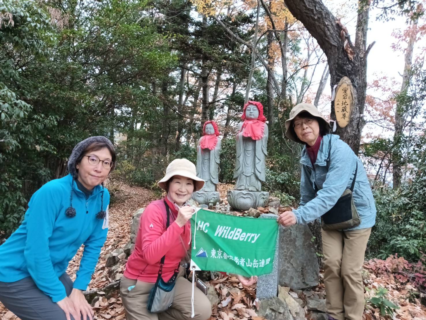 12/3(水) 高尾駅北口9時集合,前日にキャンセルが入ったので、4名 参加。 高尾駅9:12発小仏行 バスで 駒木野バス停下車。小仏関所跡の広場で体操。本日のキーワードは「北」と「城」。北は北高尾山稜の始まりの登山口から出発しました。地蔵平で4体の地蔵さんと記念撮影。この頃から、今日は他の人と会わないね、でもそのうち会うのでは・・、これが話題になった。上りの厳しい熊笹山、下りた所から富士見台への上りの間の尾根は素晴らし紅葉が楽しめた。富士見台で昼食、我々だけ。寒さもあって、短い昼食後は八王子城山に向けて下る。途中、詰めの城。2つ目のキーワード「城」、当時の巨大な山城を少しでもイメージして、黙々と歩く。八王子神社に着く頃に太陽が目を覚まし、紅葉に光りを与えた。神社前のいちょうの大木の黄金色の迫力、年期が入っている。ここでも人に会わない。8合目柵門跡で、旧道で下りる事を選択。この道で人に会う確率は低い。ついに、八王子城址入口まで、誰とも会わないと珍記録を達成。記念に写真を一枚。この後、無人野菜販売を見ながら霊園バス停まで歩く。14:45着。歩き3H45 5.6km 上り520m 下り472m(T記)