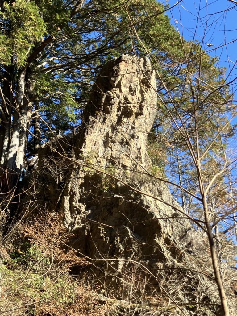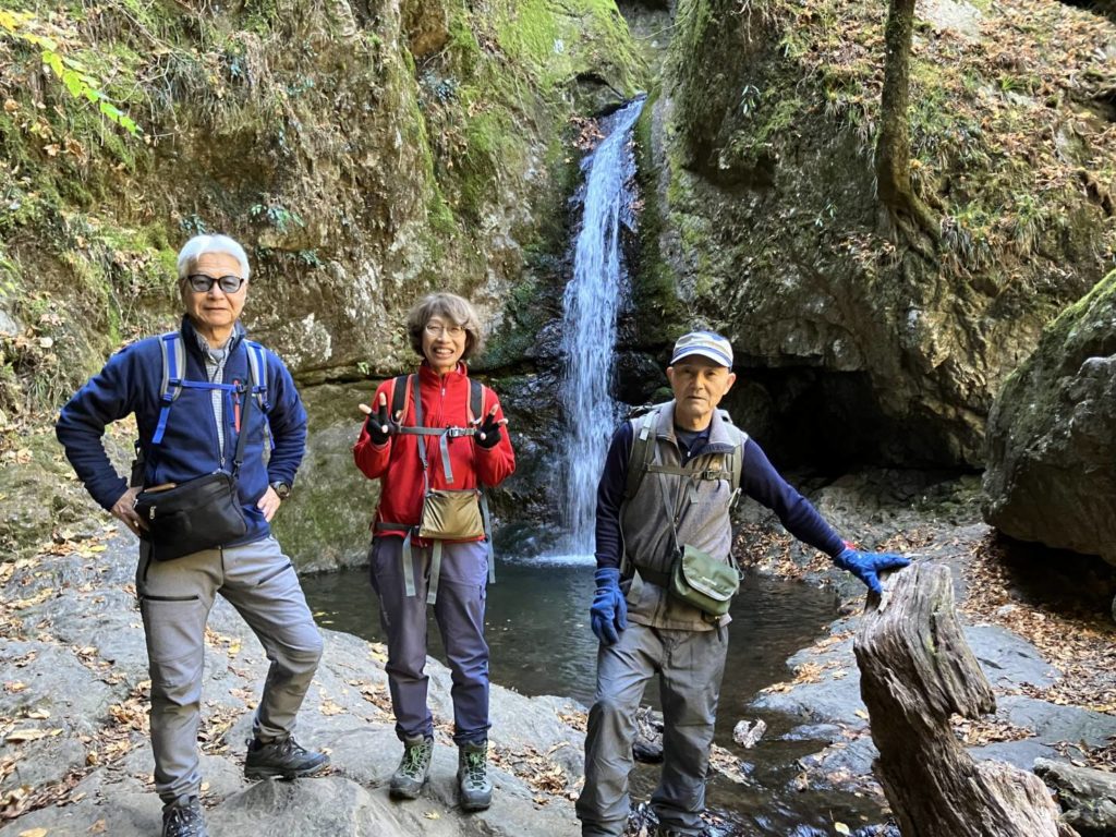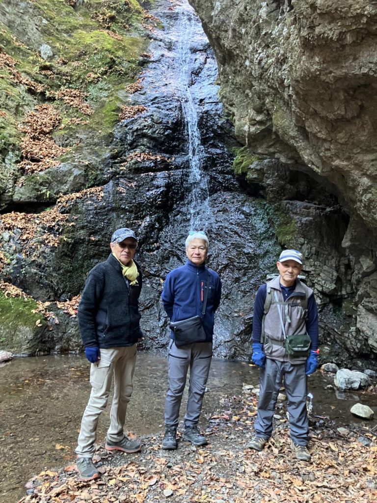 12/7(日)Aコース御岳山ロックガーデン組のメンバーは4名。立川から乗車の3名は青梅駅発の電車で合流し、T氏と御嶽駅バス停で落ち合う。ケーブルカーを乗り継ぎ御岳山駅に9時到着。御嶽駅では肌寒く感じたが御岳山駅では標高は高いが日差しもありそれほど寒さを感じなかった。トイレを済ませ、まずは七尾平に向かって出発。時間に余裕があったので七尾平の先端の展望台まで足を延ばした。太陽の光が強すぎるためか少し霞んで見えるが遠くの筑波山や都心のビル群、スカイツリー、それと光に反射した東京湾も見渡すことができた。シーズンともなれば鍋を囲んでの宴会もできそうな広い空間も紅葉シーズンが終わり、ガラガラであった。そこから七代の滝へ150mを20分ほどで一気に下った。雨がほとんど降っていないせいもあり水量はいつもの半分以下のようであった。80mほど急な階段を登ると天狗岩に到着。そこでプチ岩登りを楽しむ。ここからは苔むした沢沿いの道でロックガーデンへ。ここの沢も水量が少なくコケも弱弱しく感じられたが水量の多い新緑の頃から初夏に来れば違った趣があると思った。ロックガーデンのベンチで休憩を取り綾広の滝へ。そこでは滝行が行われているようで最近できた小屋が建てられていた。今日は滝行を行うには水量が乏しく、できない状況であった。5分ほど登ると大岳山への分岐に到着。ここから七尾平までほぼ平坦な道を歩く。七尾平ではワイン小屋が開いており,数名のグループがワインを楽しんでいた。我々も時間があったので冬の暖かい陽を浴びてベンチで30分ほど談笑しながら過ごした。途中でBチームのメンバーと合流し忘年会場の山香荘へ。入浴後、各々今年1年の出来事や来年の抱負等を発表しあい、今年1年の締めくくりとした。ロックガーデンのコースは2つの滝、プチ岩登りや苔むした渓流沿いの道等バラエティーに富んだハイキングが手軽に楽しめるコースであり、また違う季節に来たいと思えるコースであった。山香荘の料理はリーズナブルでおいしく、温泉にも入れるとても良いお店であった。距離6.1Km 上り385m 下り358m(S記)