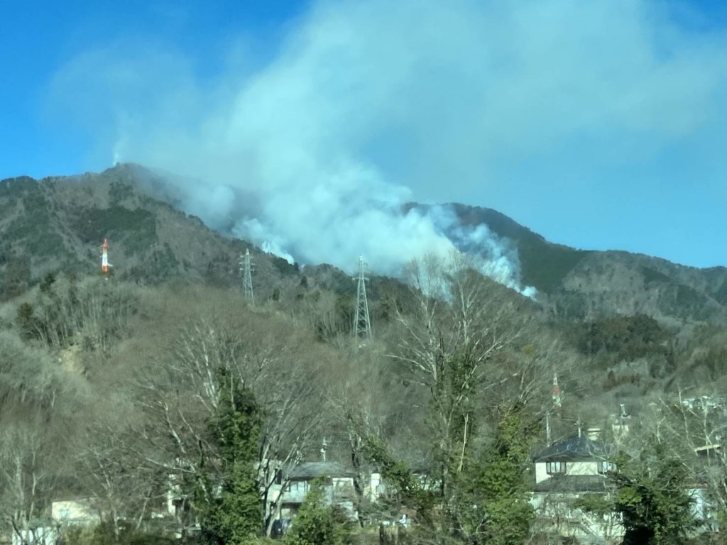 都留アルプス、前方富士山、後方には燃える扇山