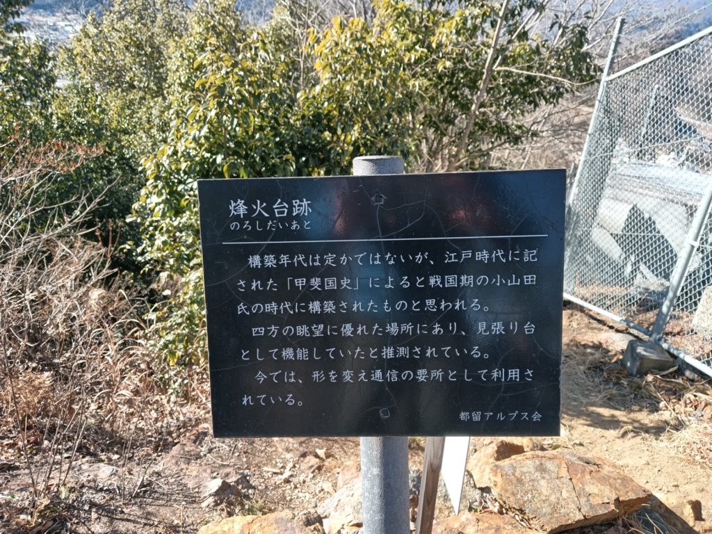 1/14(水)今年2回目の登山寿命を延ばす山行(26-2)は都留アルプス。参加者は3名だが、久々にOさんが参加して話しが弾む。高尾駅発8:25、話題は扇山の山火事、1/8に始まり1週間経つが鎮火せず心配だ。鳥沢駅辺りから燃え続ける様子が見え、2つの尾根に煙が立ち込めている。 大月駅で富士急線に乗り換え都留市で下車。登山口のある谷村発電所へ向かう。近くのひまわり幼稚園横で準備体操。一挙に高度を上げる登り、道横にオニグルミとミズキの大木。登り切った横に富士山展望台。雪をかぶった雄大な富士山が正面に、左に杓子山。次に戦後時代の小山田氏の狼煙台があった蟻山(658m)へ。ここからは下り、白木山、長安寺山を過ぎると、パノラマ展望台がある。富士山に近づいたのに、さっき展望台台より富士山は小さくしか見えない。このコースの名所、水道橋(ピーヤ)に到着。この橋の下で手を叩くと鳴き龍のような反響がする。 風が出てきた。元坂にも一回り小さい水道橋がある。そこから登って友愛の森の東屋で昼食。風を遮るものが無く寒い。早めに切り上げて千本桜植生地、楽山公園分岐に向う。ここは180°のパノラマ展望、九鬼山(後方に燃える扇山)から三つ峠までが目の前にある。ベンチで記念撮影、その後楽山公園へ一挙に下る。都留文科大学の構内に入り、富士急の都留文科大学前駅へ。12:59発に間に合った。2H45 5.7km 上り411m 下り376m