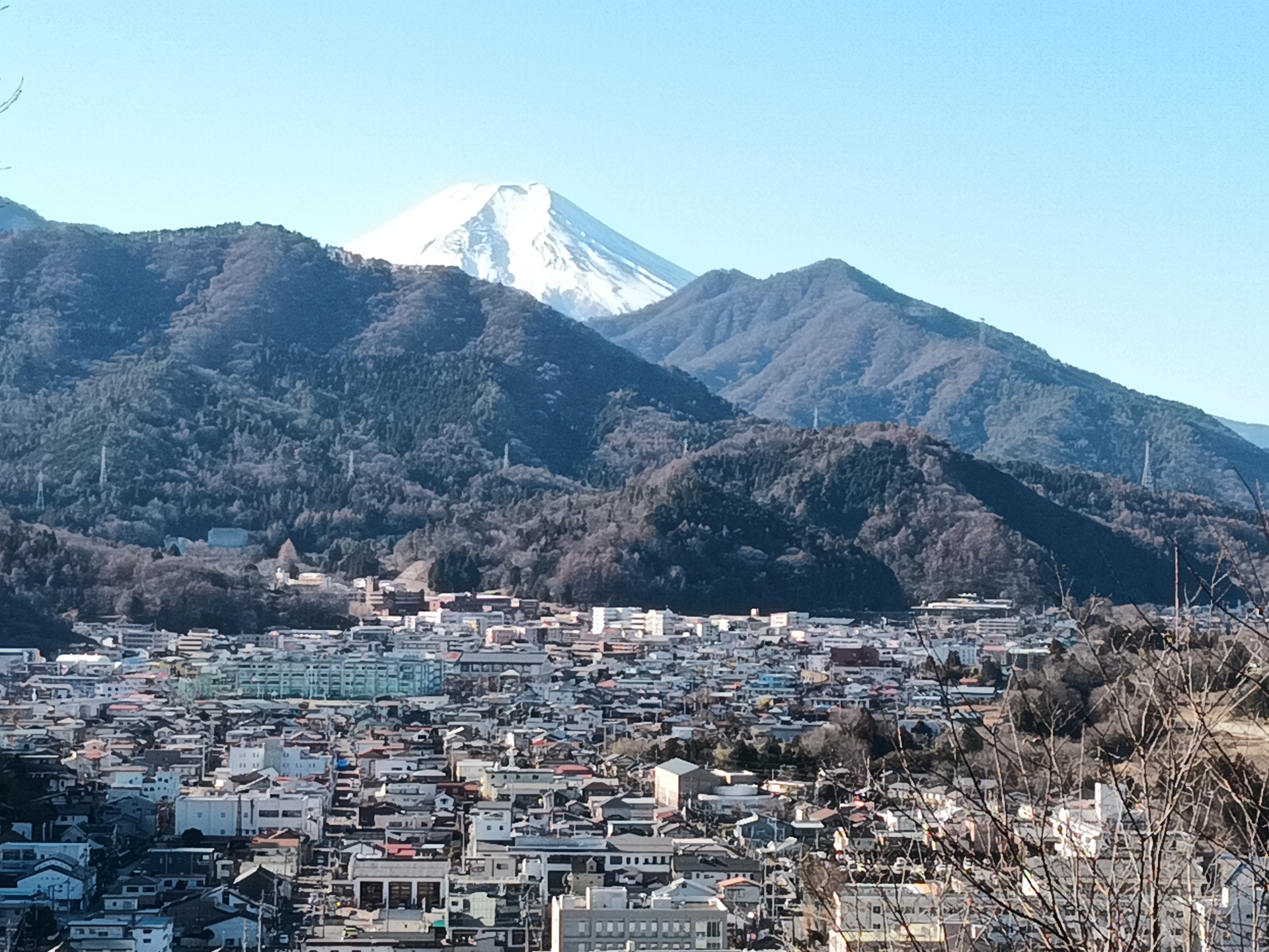 都留アルプス、前方富士山、後方には燃える扇山