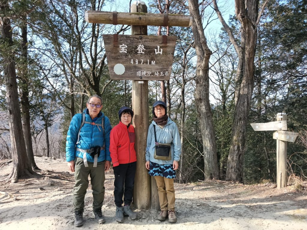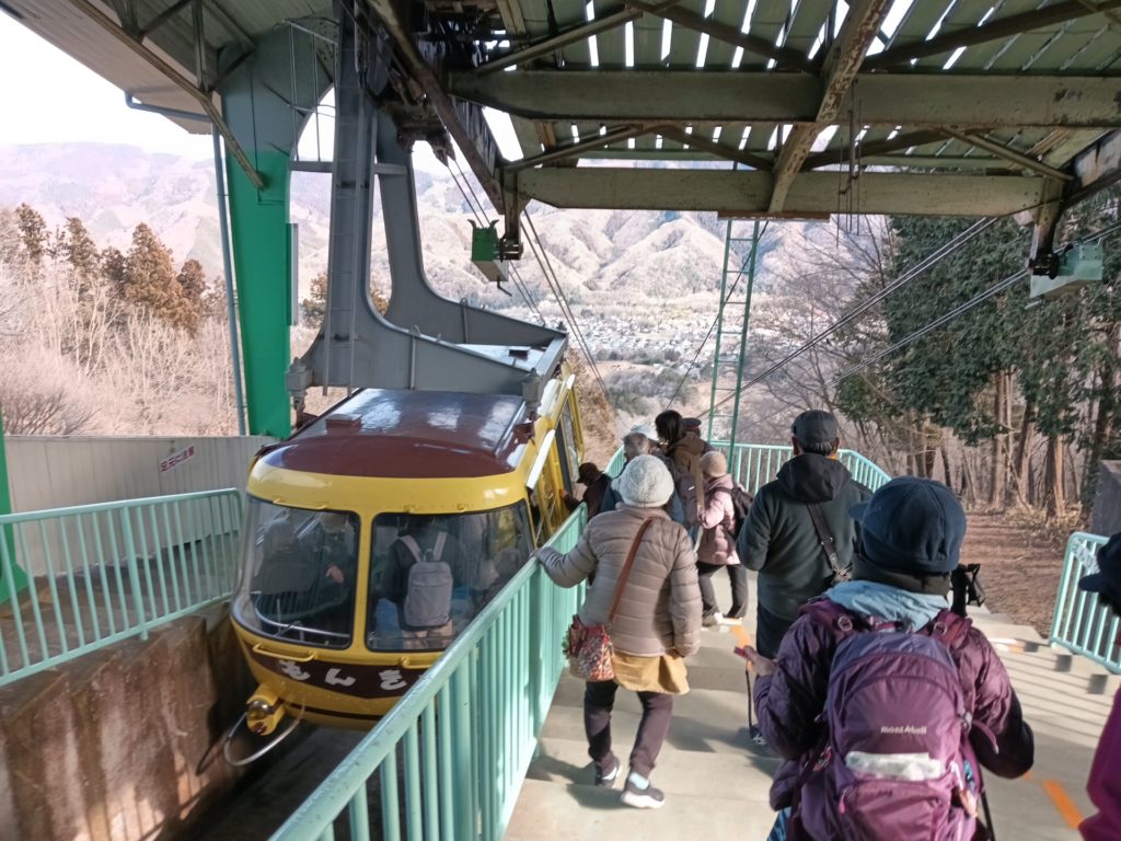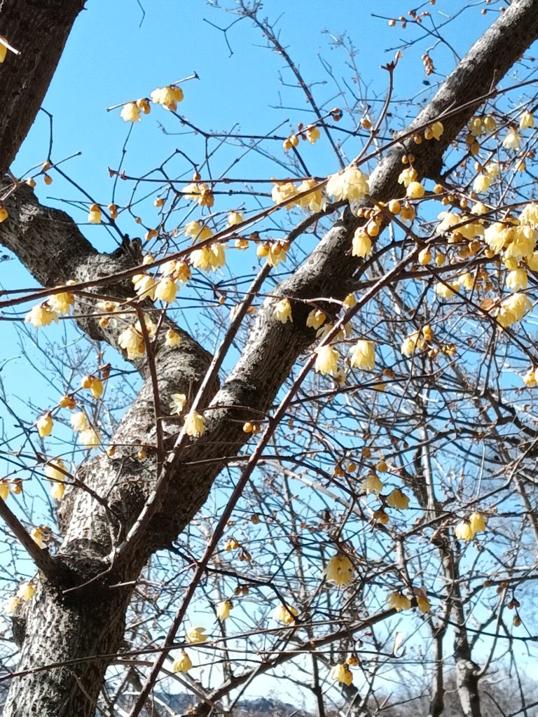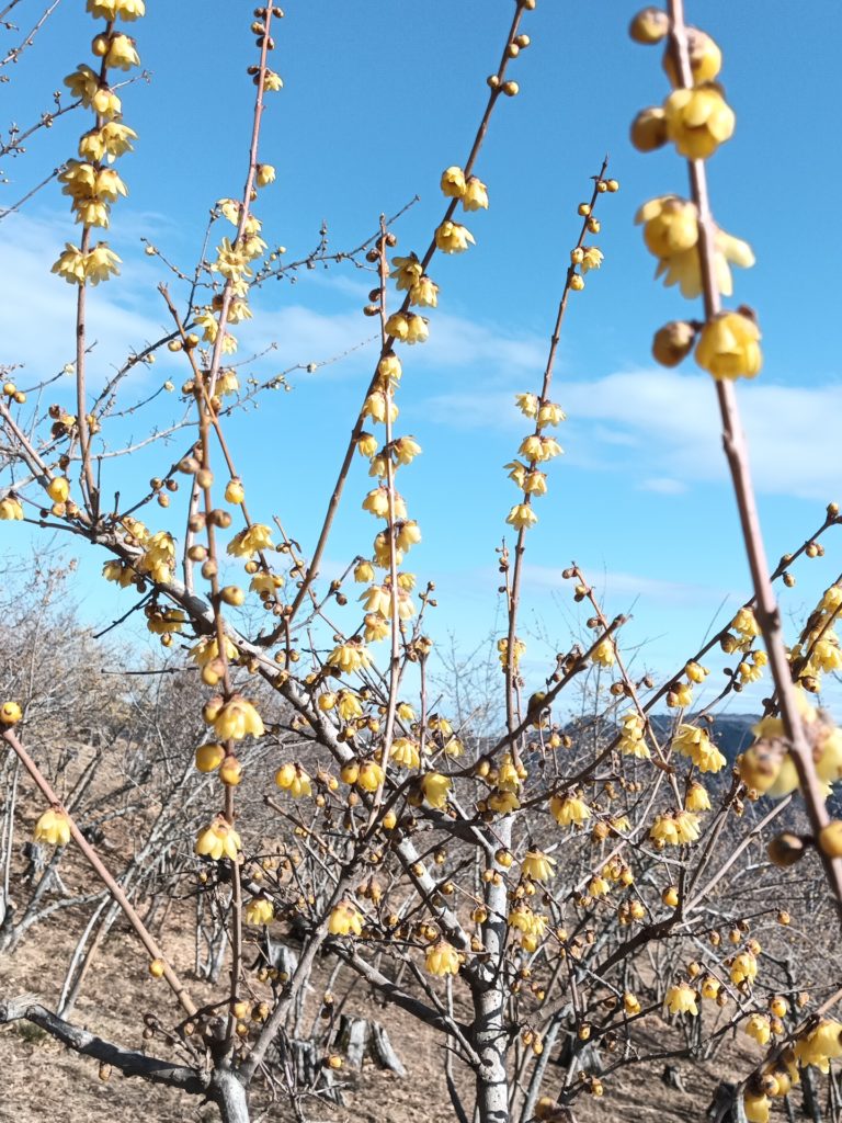 1/28(水)蝋梅を求めて、宝登山へ。八王子駅発の八高線に会員2名と元会員Oさんの3名。東飯能で 西武線乗換8:55 、 西武秩父駅9:41着。 歩いて御花畑10時発 野上駅10:23着。この野上駅から宝登山への2時間は、長瀞アルプスと呼ばれるコースだ。最初の登りから稜線に出ると、歩きやすい。途中、野上峠手前で昼食をとり、小鳥峠、ナラサワ峠からは車道でぐるっと宝登山を回り込む。最後で最大の試練、階段が待っていた。何時登っても、キツイ。山頂に出たら、新設された展望台があって、ソファまである。目的の蝋梅は2分咲き、福寿草はほんの僅かで残念。下りはロープウェイを使う。宝登山神社にお参りして、暖を求めて喫茶店へ。田舎お汁粉で疲れをとる。2H30分 5.8km 登り 431m 下り123m