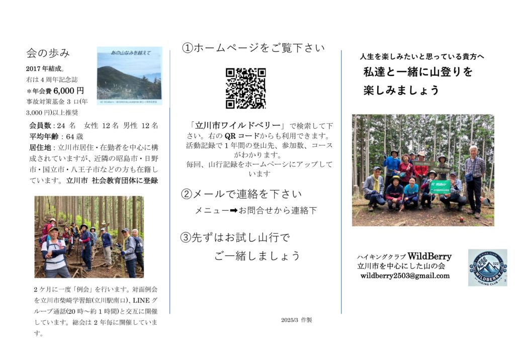 その後 2017年11月に東京都勤労者山岳連盟に加入し、わずか6名でスタートしました。当初は山 行の多くがほとんど数名で同じメンバーが多かったのですが、2018年から「たちかわ市民大学 セミナー」を開催すると毎年数名の修了生が入会してきました。ここ4年間で入会した会員を含めて22名へと成長しました。